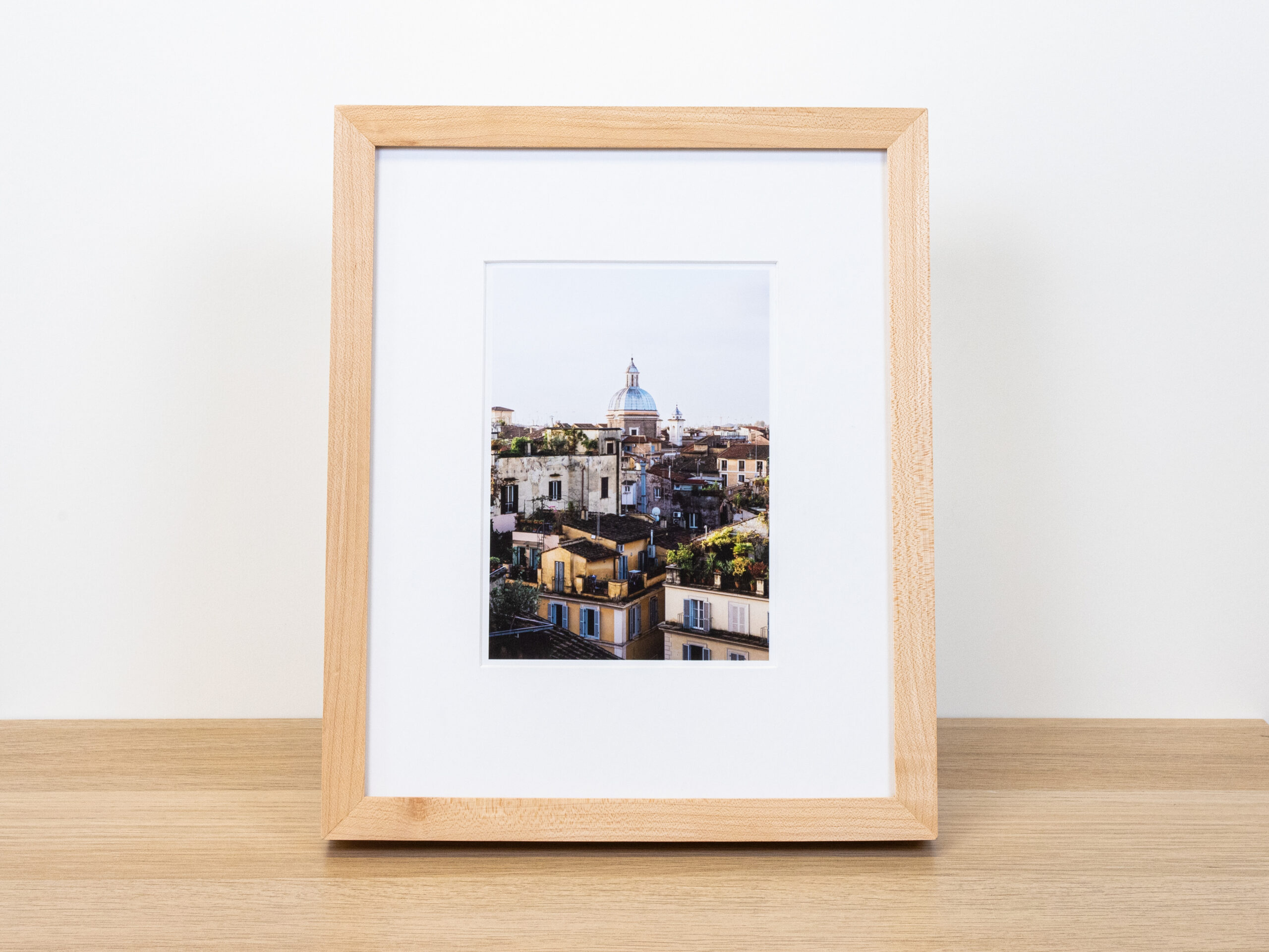 Elegant photograph of roof top’s in Rome by local artist Collin Howell. Presented in a contemporary solid maple hardwood frame. Hanging hardware included.